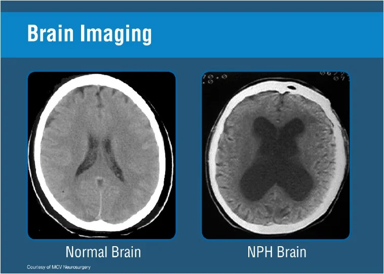 Gait disturbance is the first of the triad of symptoms to appear in all classic cases of NPH. Some feel as if their feet are glued to the floor and then walk with a shuffle. The second NPH symptom, short-term memory loss, soon follows. The man’s wife told doctors that her husband’s mental state had changed. He was slow in thought, spoke slowly, was easily confused, unfocused and very forgetful. The third NPH symptom is incontinence or urinary urgency. The man looked untidy as his pants were often soiled from dribbling urine. His wife said that he did nothing but sit and just exist most of the time, and wasn’t interested or worried about anything. X-ray images of his brain